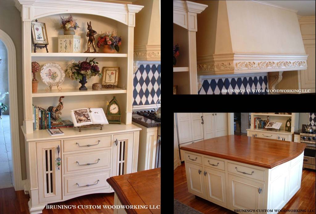 We also designed, built, finished and installed this rustic, heavily distressed knotty alder kitchen for a Littleton home. We use soft close hinges and drawer glides in all of our cabinetry. | Custom island with antiqued ebony base cabinet with a 2-3/4" thick, solid walnut top for a client in Evergreen. | We built this French Country kitchen with a custom painted finish and solid cherry island top for a client in Parker. |